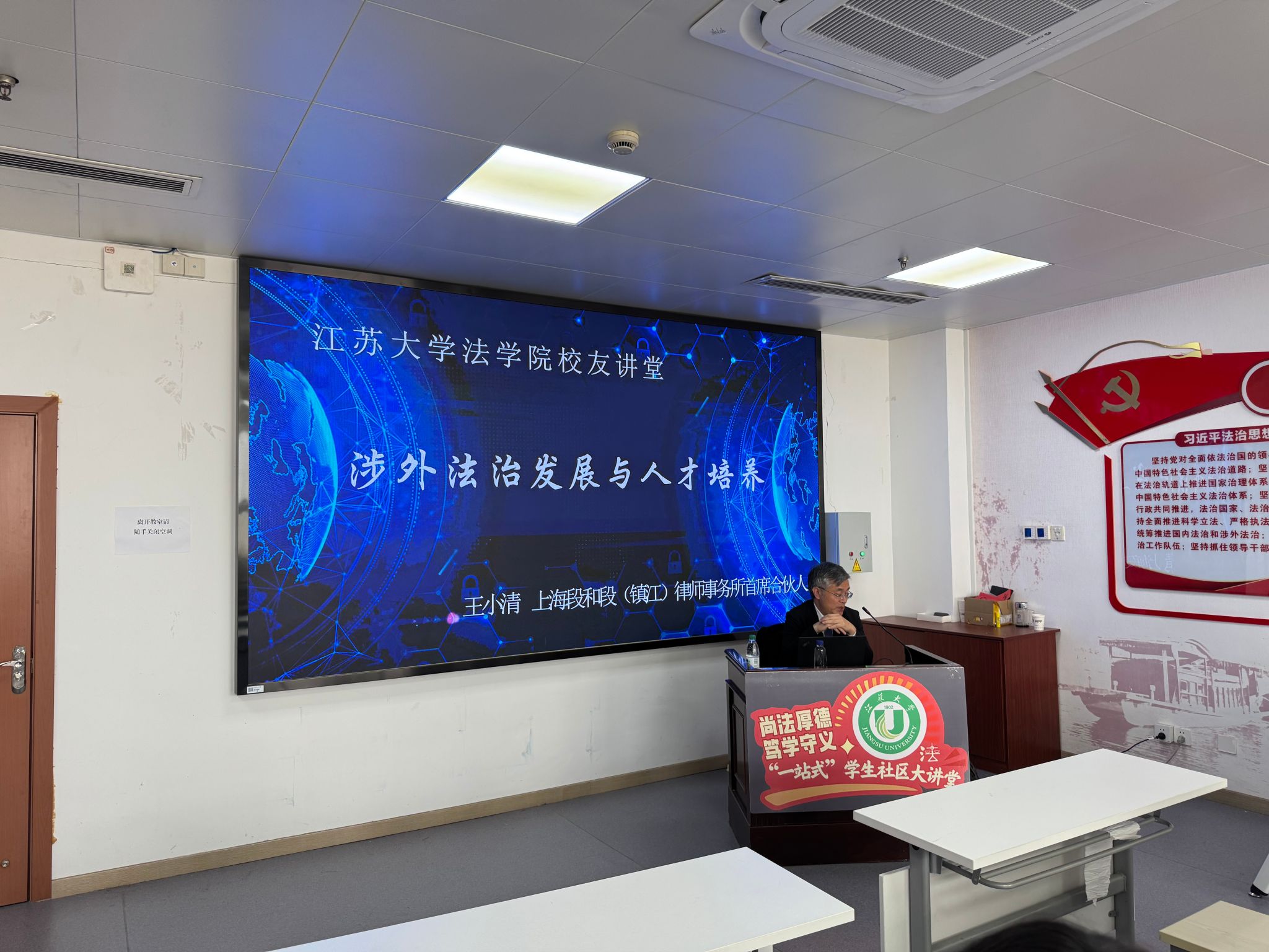 为深入探讨涉外法治建设前沿动态,提升学生国际视野与职业素养,10月26日,法学院于玻璃房1620开展“法学院‘一站式’学生社区大讲堂”系列活动暨涉外法治发展与人才培养主题校友讲座。本次活动由法学院副院长方晓霞主持,江苏省律师协会副会长、镇江市律师协会会长王小清校友主讲,40 余名师生现场参与。